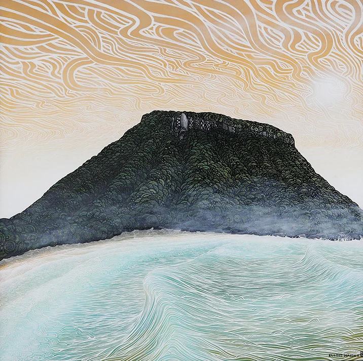 Wahi Tapu is from a series of paintings that delve into the history and cultural significance of the geography of Tauranga, utilising traditional Maori motifs like the tukutuku ‘x’ patterns as well as using European and colonial landscape painting styles and traditions.